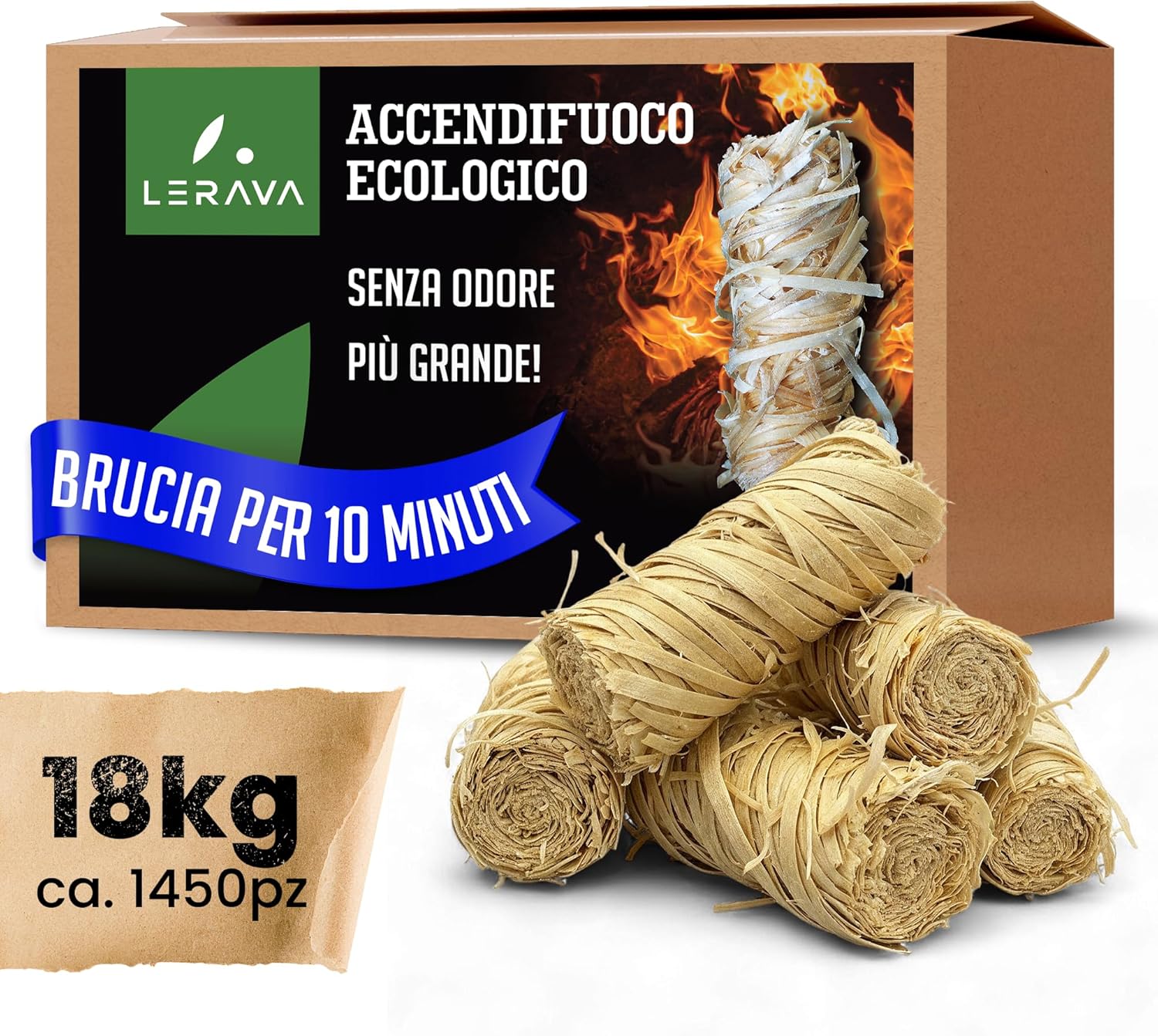 LERAVA Accendifuoco Ecologico 18kg (ca. 1450pz): fiamma forte, lunga durata e sicurezza naturale per barbecue, camino e stufa FSC certificato